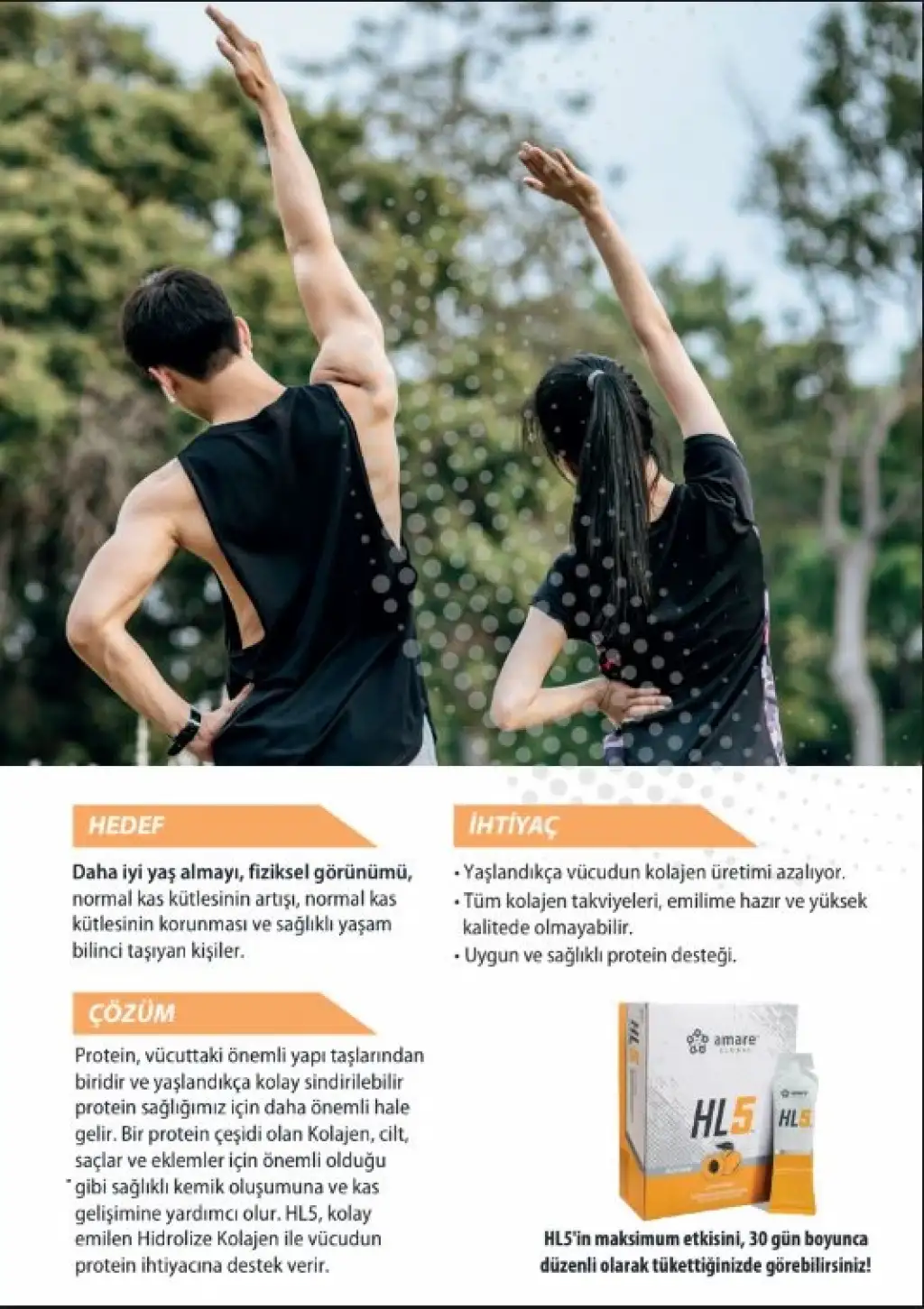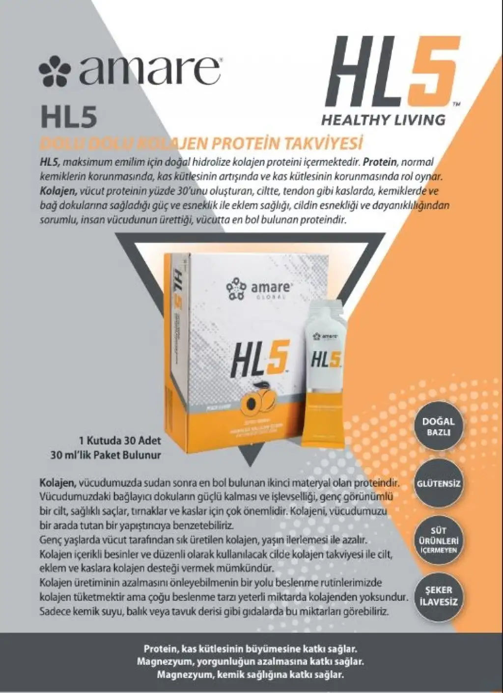 HL5, maksimum emilim için 5 gram dogal hidrolize kolajen proteini içermektedir. Protein, normal kemiklerin korunmasinda, kas kütlesinin artisinda ve kas kütlesinin korunmasinda rol oynar. Kolajen, vücut proteinin yüzde 30’unu olusturan, ciltte, tendon gibi kaslarda bulunan, kemiklerde ve bag dokularina sagladigi güç ve esneklik ile eklem sagligi, cildin esnekligi ve dayanikliligindan sorumlu, insan vücudunun ürettigi, vücutta en bol bulunan proteindir.