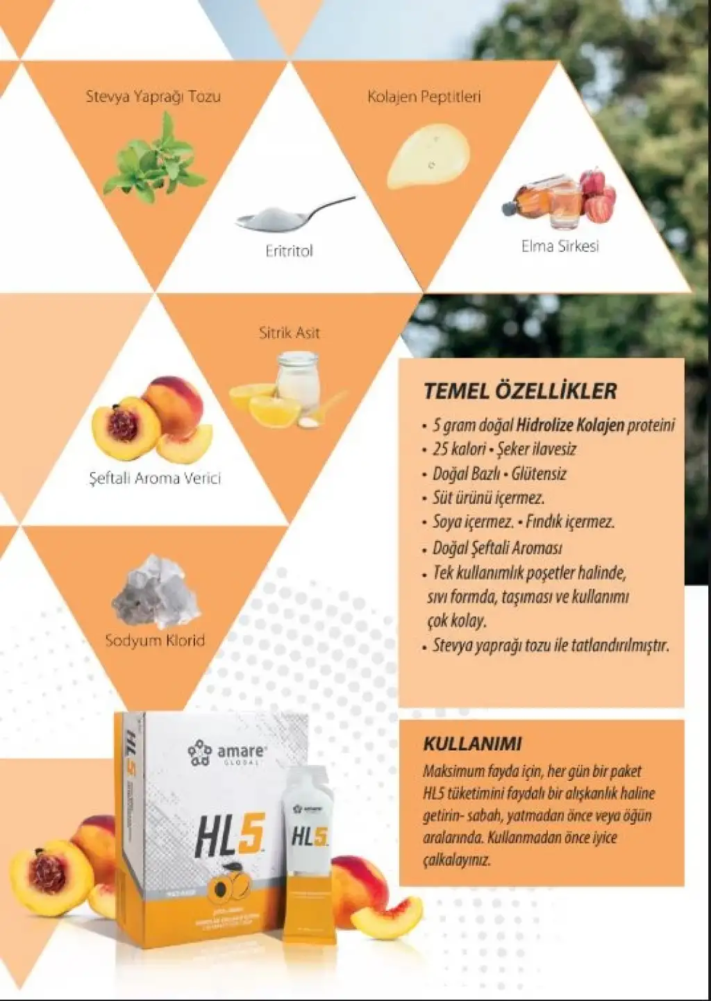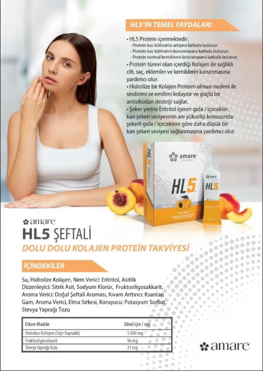 HL5, tüketimi kolay paketlerde sunulur, dogal seftali aromalidir. Sadece 25 kalori ve seker ilavesizdir. Ögün aralarinda veya geceleri atistirma yerine geçebilir, smoothie‘ye eklenebilir, sicak su veya çay ile karistirilarak tüketilebilir.