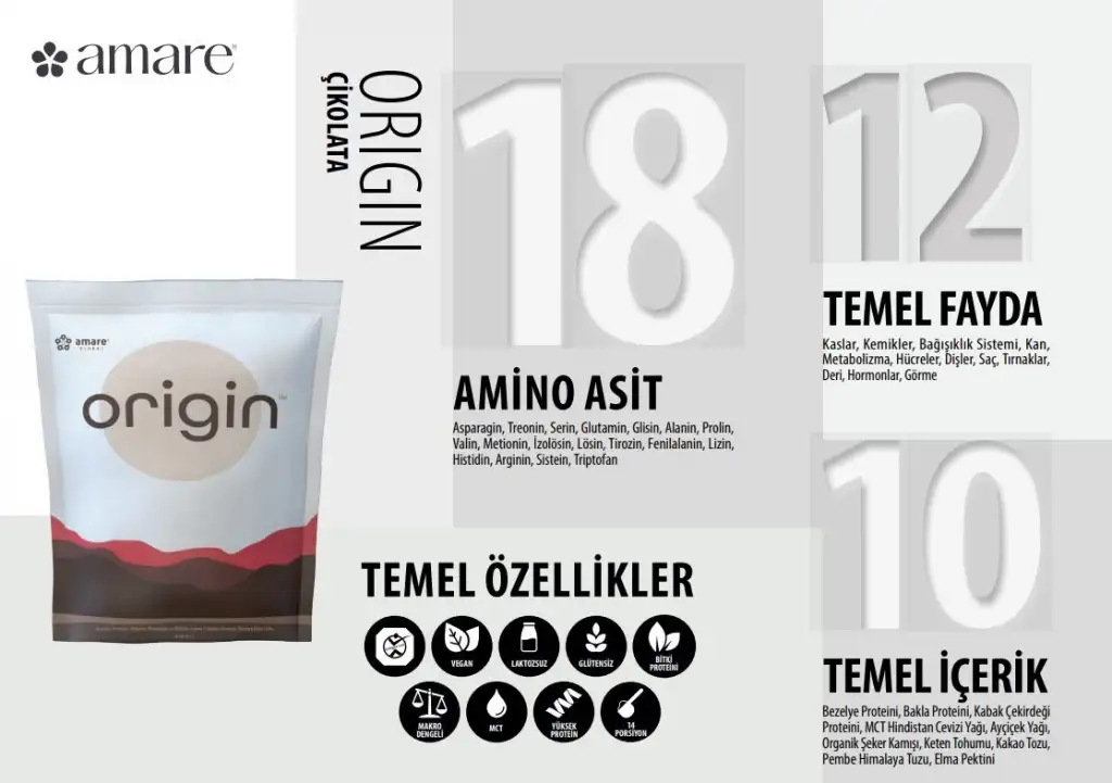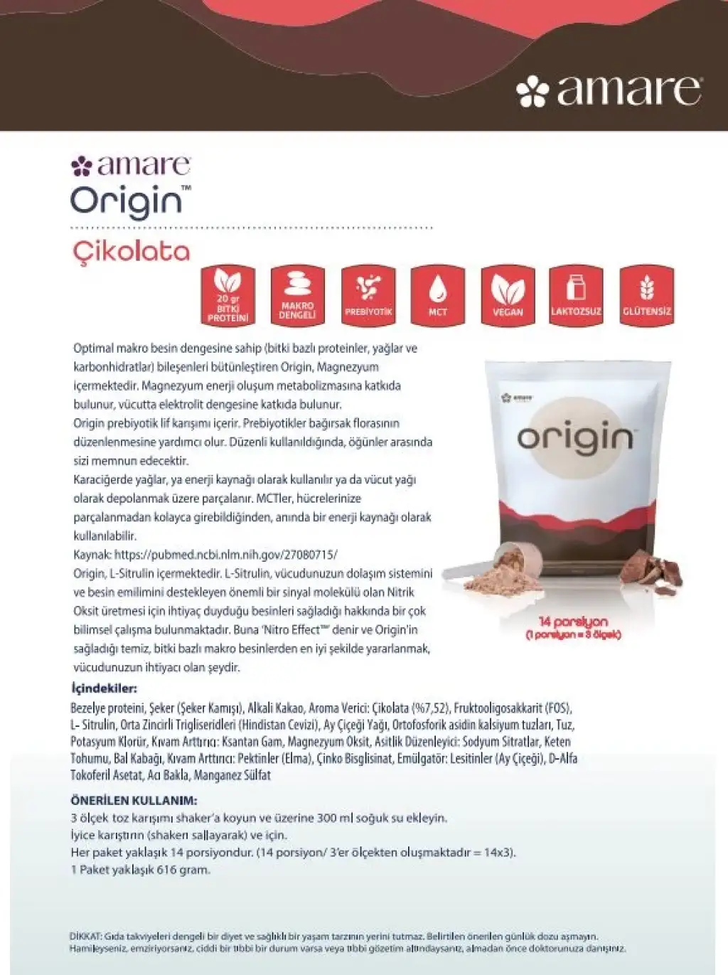 Optimal makro besin dengesine sahip (bitki bazli proteinler, yaglar ve karbonhidratlar) bilesenleri bütünlestiren Origin, Magnezyum içermektedir. Magnezyum enerji olusum metabolizmasina katkida bulunur, vücutta elektrolit dengesine katkida bulunur.