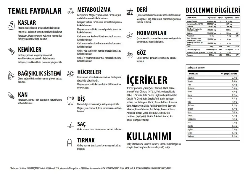 10 Temel Içerik: Bezelye Proteini, Bakla Proteini, Kabak Çekirdegi Proteini, MCT Hindistan Cevizi Yagi, Ayçiçek Yagi, Organik Seker Kamisi, Keten Tohumu, Kakao Tozu, Pembe Himalaya Tuzu, Elma Pektini