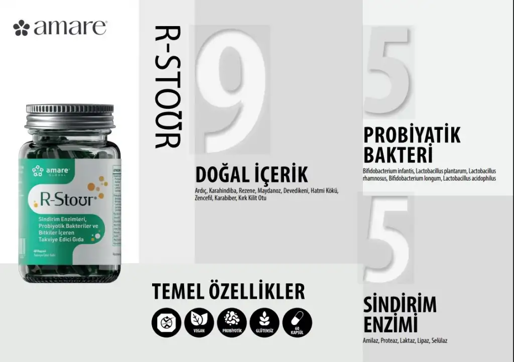 R-Sto?r, düzenli sindirimi desteklemek için özel olarak tasarlanmis yenilikçi bir probiyotik karisimdir. R-Sto?r 5’i 1 arada formülünün içinde bulunan NitroBiotics™ karisim, sindirim sistemini düzenlemeye ve bagisiklik sistemini desteklemeye yardimci olur. Ayrica, R-Sto?r hassas arastirmalar sonucunda tespit edilen, içeriginde bitki bazli sindirim enzimleri bulunan bitkiler içeren özel bir karisimdir.
