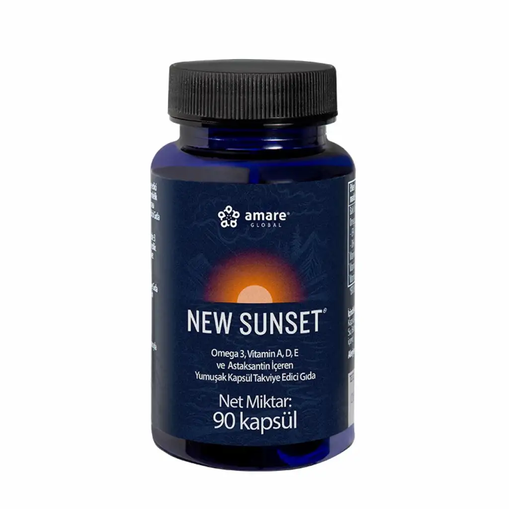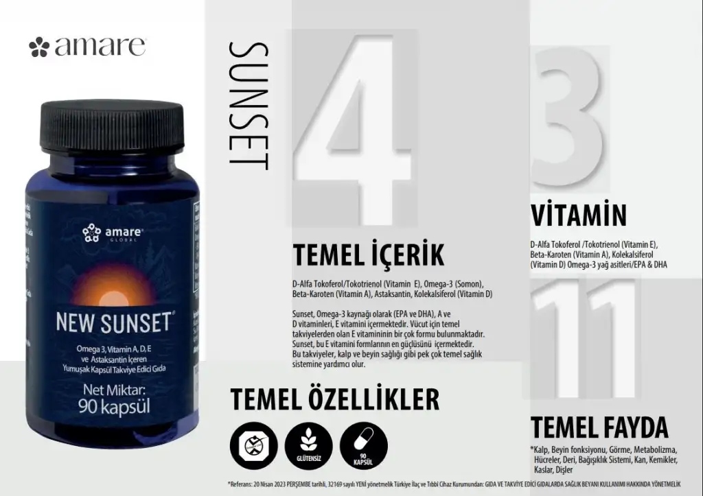 Omega-3 yağ asitleri, vücut tarafından üretilemeyen güçlü besinlerdir ve bu nedenle takviyeler yoluyla edinilmesi tavsiye edilmektedir. Amare Global, Sunset’te bulunan Omega-3’ü, Vahşi Alaska Somonu’nun da dahil olduğu vahşi balıklardan yani en doğal kaynaktan alır. Amare Global Sunset, E Vitamini, Omega-3 Yağ Asitleri (EPA ve DHA), A ve D3 Vitaminleri ve Astaksantin içermektedir. Amare Global Sunset, beslenme rutinimize katkı sağlayacak vitamin ve minerallerin bir kombinasyonudur. EPA ve DHA, kalbin normal fonksiyonuna katkıda bulunur. A ve D3 Vitaminleri, bağışıklık sisteminin normal fonksiyonunda rol oynar. DHA normal beyin fonksiyonlarının korunmasına yardımcı olur. *Faydalı etkinin sağlanabilmesi için günde 250 mg EPA ve DHA alınmalıdır. Dengeli ve çeşitli beslenme sağlıklı yaşam için önemlidir. Aşırı tüketim laksatif etki yaratabilir. Faydalı etki günde 250 mg DHA alındığında sağlanacaktır.