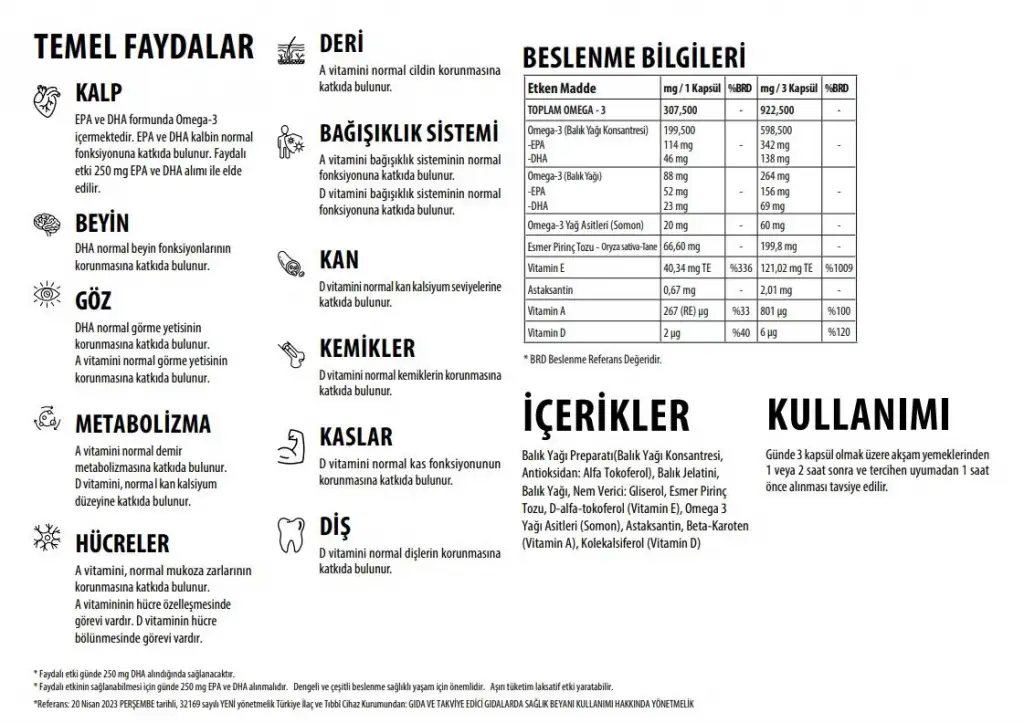 ** Faydalı etkinin sağlanabilmesi için günde 250 mg EPA ve DHA alınmalıdır. Dengeli ve çeşitli beslenme sağlıklı yaşam için önemlidir. Aşırı tüketim laksatif etki yaratabilir.